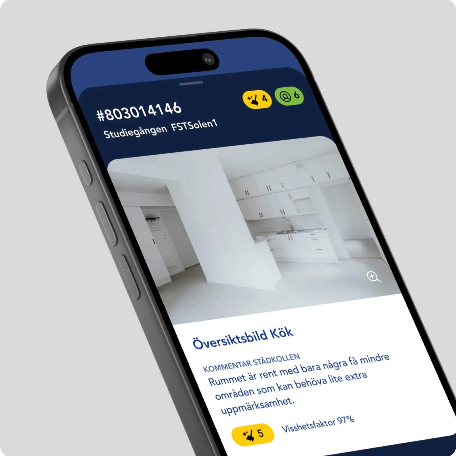 Med vår lösning blir flyttstädningen smidigare och mer förutsägbar – både för er och era hyresgäster. Boende får direkt feedback på städningens kvalitet, vilket gör att brister kan åtgärdas omgående och fler städningar godkänns vid första försöket. Tydliga instruktioner för städningen minskar missförstånd och säkerställer en jämn kvalitet. Resultatet är en bättre upplevelse för den inflyttande, mindre stress för den utflyttande och färre ombesiktningar för er.